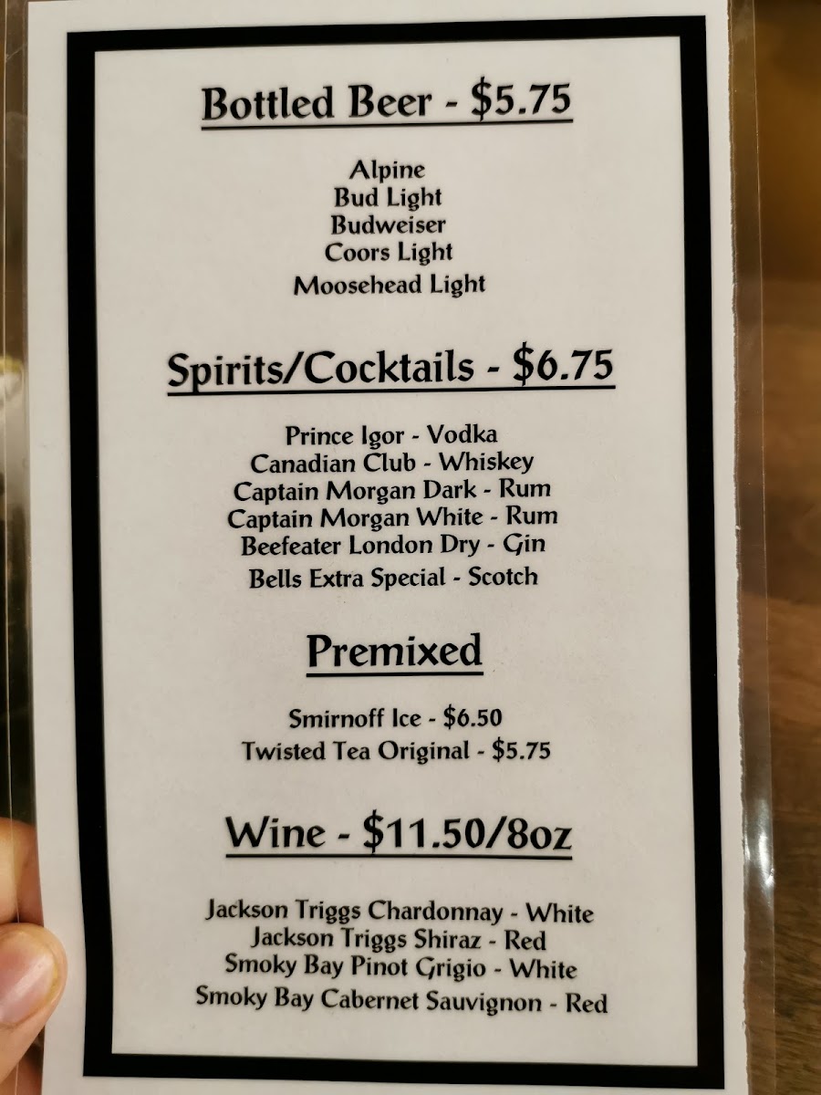 The bar menu is equally impressive, featuring classic spirits and refreshing cocktails that will perfectly complement your meal. Whether you opt for a smooth Canadian Club or try out the luscious Smirnoff Ice, there's something for everyone to enjoy.